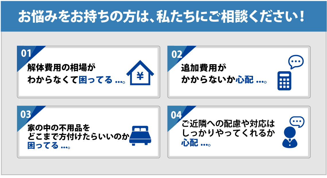 解体工事の値段、費用、相場を知りたいといった時、解体業者選びは大切です。安心、信頼できる解体業者に依頼をすることで、解体工事におけるトラブル、クレームなどをグッと減らすことができます。