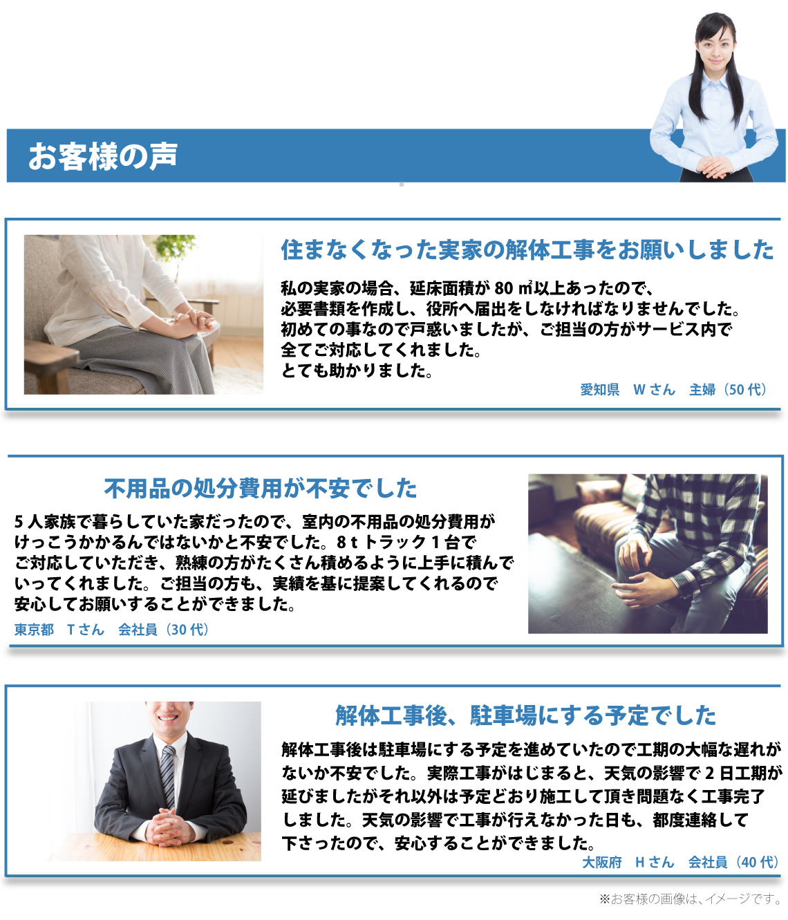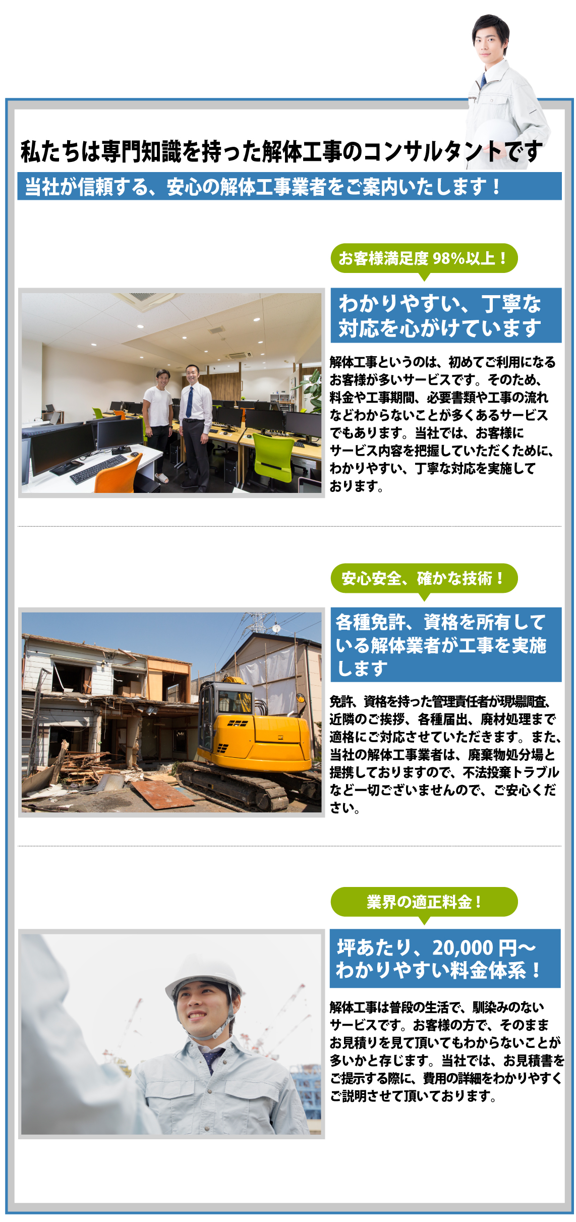 ・解体工事用重機などの免許から、建築士、建設機械施工技士、土木施工管理技士などの資格まで安全な工事を安心してご依頼いただけます。・シンプルでわかりやすい料金システムになっております。はじめての解体工事で相場や適正な価格がわからないといった方のためにも相見積もりをお受けいたしております。当社で見積もりが少しでも安くなるように努め、できるだけ最安値、低価格を目指します。また、お見積もり価格の内訳も、わかりやすくした上で、もちろん追加費用もかかりません。・木造(W)、鉄骨造(S)、鉄筋コンクリート造(RC)、鉄骨鉄筋コンクリート造(SRC)などあらゆる工作物、構造物にご対応いたします。・サービス内におきまして、各種届出(提出、申請、登録、契約)を行います。・電線の撤去や水道の閉栓など、インフラの撤去手続きも各種会社へ連絡いたします。ガスにつきましては、着工日前日までに撤去手続きのご連絡をご契約会社へお願いいたします。・解体を行う際、残ってしまう不用品や処分に困る荷物などがありましたら、ご相談ください。・解体工事現場の調査、確認が終わりましたら、2、3日ほどでお見積りをお届けいたします。・ご契約にあたり、ご都合、ご予定が合わない場合、ご契約書を郵送して契約を取り交わすことも可能となっております。・解体工事のプロである管理者、作業員が徹底した安全管理を行います。・破損、振動、騒音、粉じんなどの対策、防止のために養生シートの設置を念入りに行います。・解体工事を始まるにあたってのご近所の方々へのご挨拶、工事における苦情の対応まで適切に行い、住民の方々へとかかるご迷惑、ご負担を最小限にいたします。また、工事の期間や概要を詳細にお知らせし、工事により発生しうるリスクについても事前にご説明いたします。・お打ち合わせどおりのスケジュールで作業が完了するように努めます。・自然災害の発生や地中埋設物の発見により工事の延長が必要となる場合もございますが、ご連絡をその都度させていただきます。・作業員の態度や服装についても誠実、清潔を保ち、敷地近辺の清掃作業も行うように管理いたします。・解体工事終了後は、現場内のゴミの回収や前面道路の清掃まで行い、最後に敷地の整地作業(敷地の凹凸をなくすために重機で踏み固める作業)を行います。・お支払いの終了後、滅失証明書(建物滅失登記に必要な書類)をお渡しいたします。